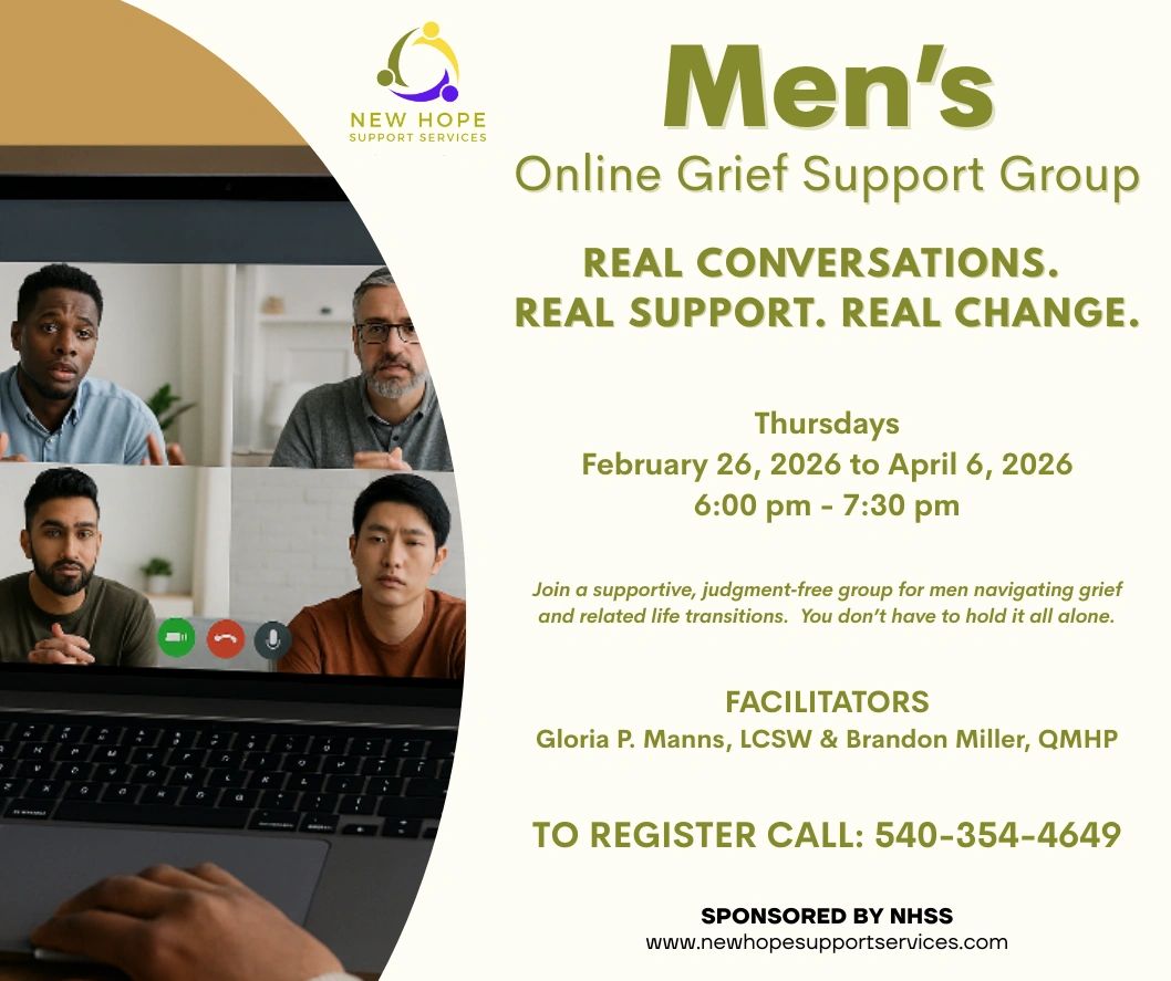 Free Men's Online Grief Support Group starts 2/26/26. For more info click here.